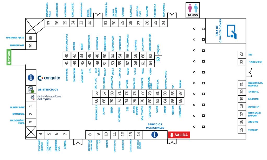 - Asimismo, encontrarás un stand donde podrás conocer los servicios gratuitos que brinda ConQuito a la ciudadanía, enfocados en temáticas de capacitación, innovación, emprendimiento y economía popular y solidaria.